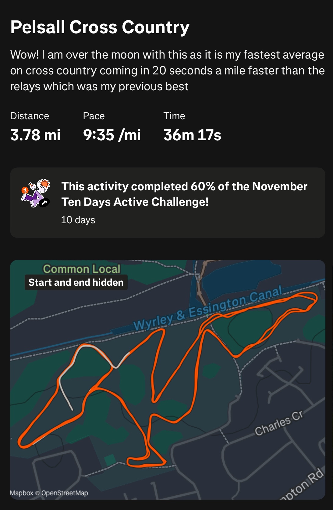 Pelsall’s course layout was…creative. It was relatively flat, but as cross-country courses go, it had a twist: two inner loops and two outer loops, complete with a detour around a children’s playground. Yes, we ran around the swings and slides, resisting the urge to hop on a swing mid-race. While it might sound odd, it added a bit of pizzazz to the race, giving us a chance to feel like big kids on a running adventure.